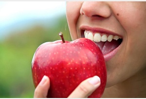• Croquer une pomme a une action stimulante pour les gencives et pour les dents. Ses propriétés anti-inflammatoires protègent aussi des gingivites et des parodontites. Le jus de pomme, agissant comme tampon de l’acidité, pourrait avoir un effet blanchissant sur l’émail des dents, le protégeant de l’érosion provoquée par la consommation courante de boissons acides comme les sodas. La pomme contient aussi beaucoup de sucres naturels, c’est pourquoi il ne faut pas négliger une bonne hygiène bucco-dentaire. ;